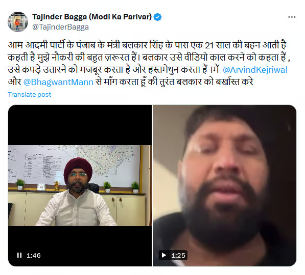 Bagga, who is the National Secretary of BJYM, shared footage of the incident on his X (formerly Twitter) account. He claimed that a 21-year-old woman approached Balkar Singh for a job. Singh, who is the local bodies minister and Kartarpur Sahib MLA, allegedly took her number and later asked her to undress on a video call if she wanted a job opportunity. Bagga alleged that Singh himself engaged in explicit acts during the call, including exposing his private parts.